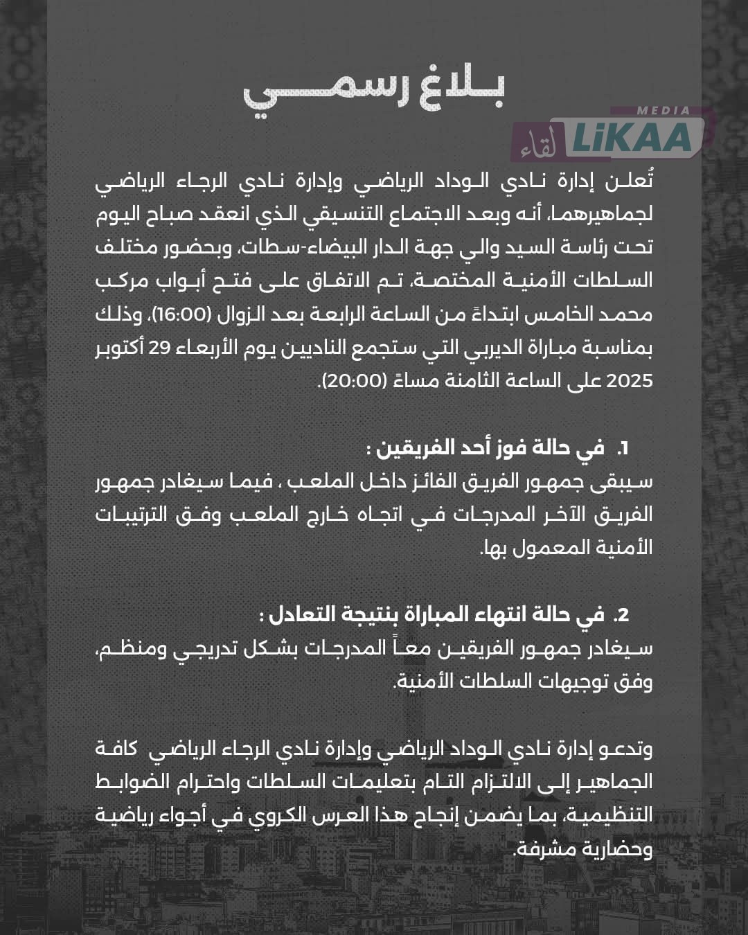 وختم البلاغ بدعوة إدارتي الناديين جماهير الوداد والرجاء إلى الالتزام التام بتعليمات السلطات واحترام الضوابط التنظيمية، من أجل إنجاح هذا الموعد الكروي الكبير في أجواء يسودها الاحترام والروح الرياضية.
